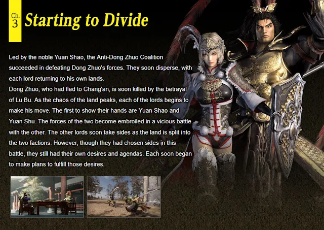 - เผยเนื้อเรื่องของเกมที่อ้างอิงตามวรรณกรรมสามก๊ก จำนวน 10 ด่าน และภาพตัวละครทั้งหน้าเก่าหน้าใหม่ จำนวน 7 คน จากเกมสามก๊ก Dynasty Warriors 9 (Shin Sangokumusou 8) 『真・三國無双8』